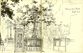 As a student at St Martins School of Art in the fifties I was encouraged to keep a sketch book. I only had to step into the street to find plenty to sketch: shop fronts, ornamental street lamps, wrought iron railings and red telephone boxes - all were full of London character and a challenge to draw.